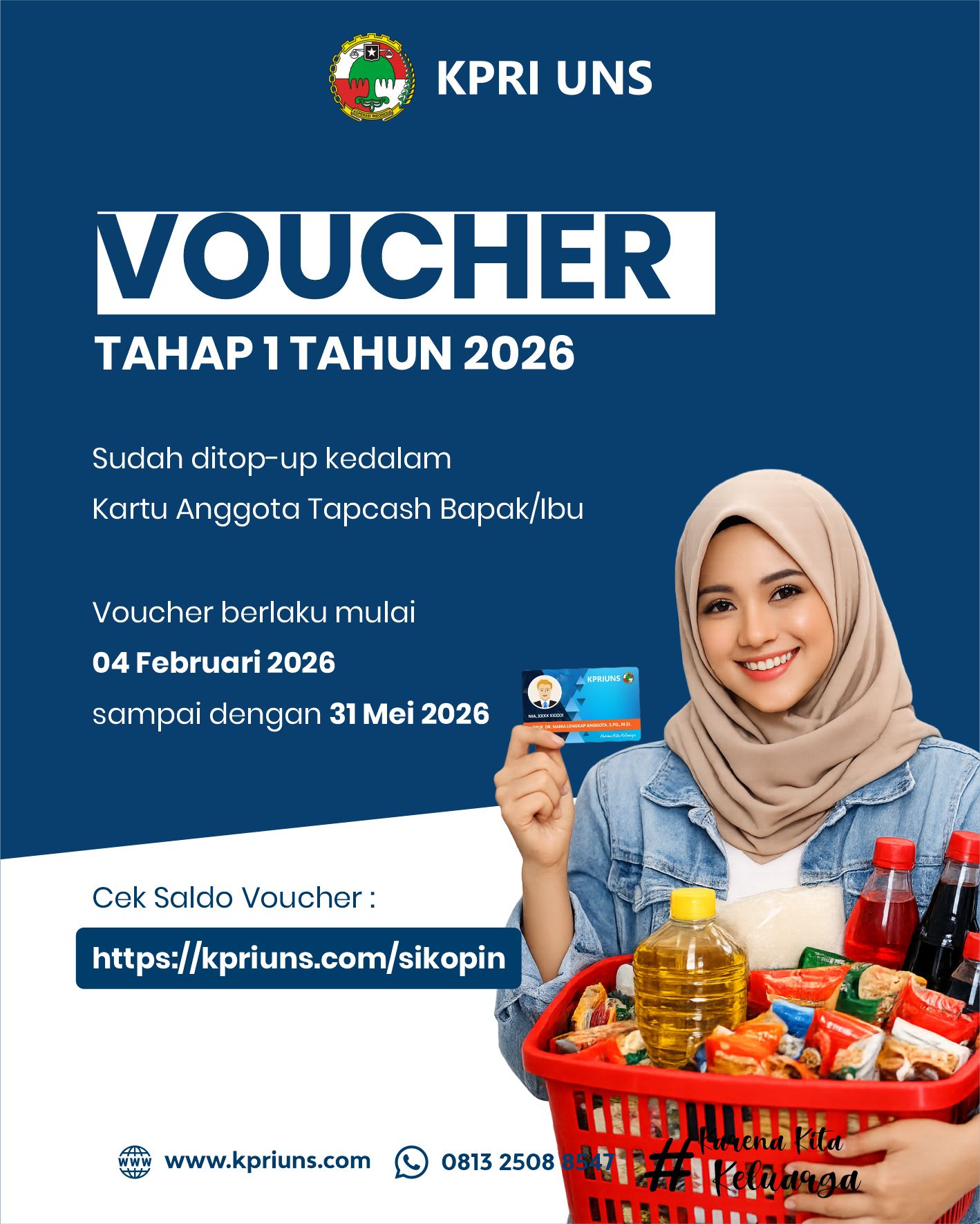 Voucher Kesejahteraan Tahap 1 Tahun 2026 sudah ditopup kedalam Kartu Anggota Tapcash Bapak/Ibu Anggota KPRI UNS untuk keanggotaan per 31 Desember 2025. Voucher dapat dibelanjakan di Mangesthi Mart sampai dengan 31 Mei 2026. Voucher tidak dapat digunakan untuk pembayaran PPOB, hanya dapat dibelanjakan dalam bentuk barang.